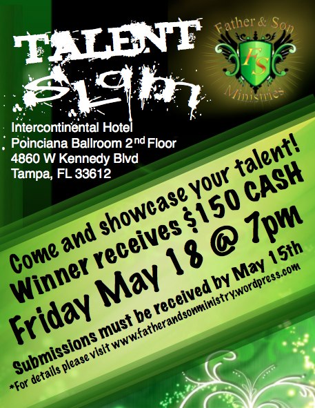 All who wish to participate are required to submit their name, phone number, category of performance, and brief description of the act they wish to perform in an email to fatherandsonministry@yahoo.com titled “Talent Slam Entry” with contact information. A confirmation email will be sent after submission has been received. Details regarding rehearsals will also be sent via email. Deadline for submission is MAY 15.